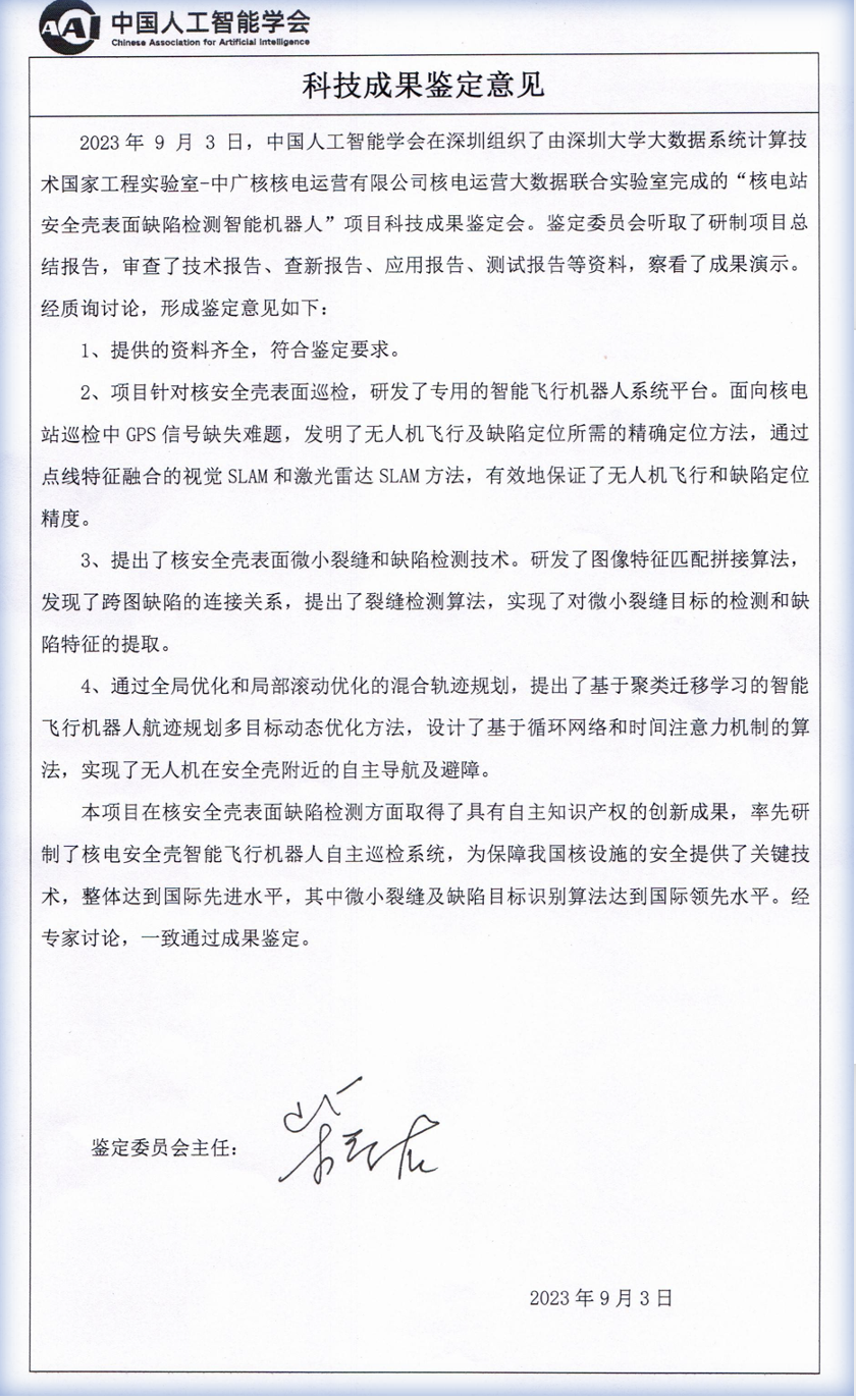 本技术已在中广核落地应用,研制了中广核电站首个安全壳检测智能机器人,能实现GPS缺失下多传感器融合精准定位、基于几何距离多样性的小目标裂缝检测。57.2m安全壳定位精度达10cm (发表在TNSE),0.05毫米裂缝检测率达95% (发表在CVPR),检测时间由1个月降低到8个小时。