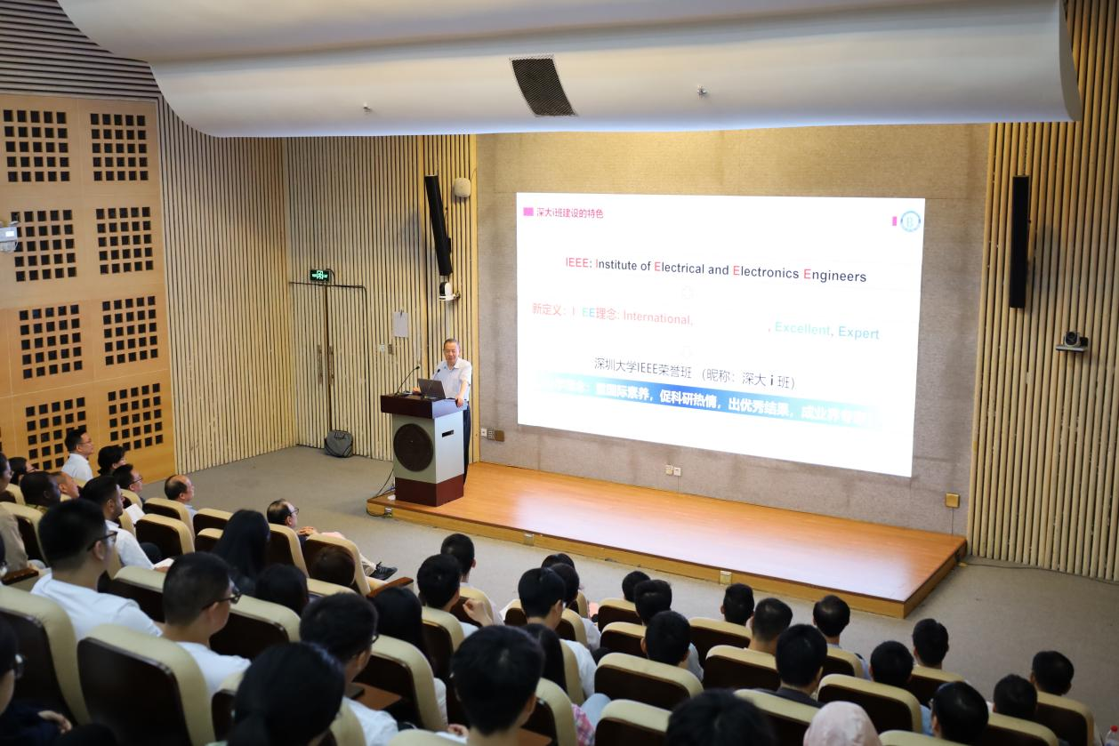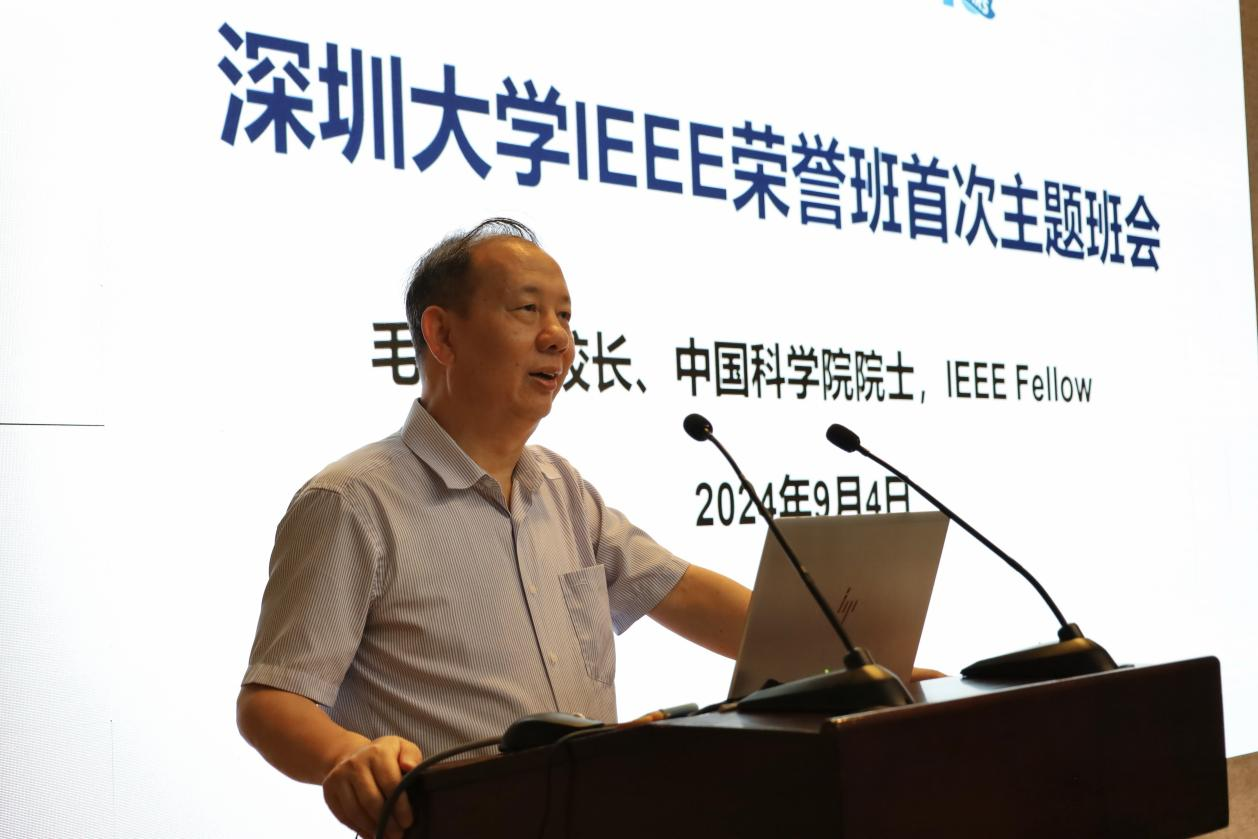 深圳大学校长、IEEE荣誉班班主任毛军发院士登台,为在场师生带来了一场主题班会。毛校长以其深邃的学术视野和丰富的人生阅历,分享了他对教育的独到见解和对学生们的殷切期望。在讲话中,毛校长鼓励大家追求卓越,坚持实干,以坚实的数理基础和深厚的人文底蕴为支撑,树立远大目标,不断进取。